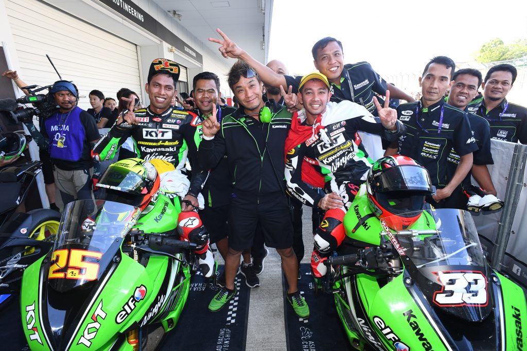 On another day of clear blue skies at Suzuka, the sun shone most brightly on the Manual Tech KYT Kawasakis, with defending champion, Azlan Shah Kamaruzaman shaking off years of bad results to lead a closely fought 1-2 in Supersport 600 Race 1. Asia Production 250 featured a bruising battle for second behind Astra Honda’s dominant Rheza Danica Ahrens, while Muhammad Helmi Azman gave a glimpse of what it takes to win an underbone race in which the first nine finished within 1.2 seconds of each other.