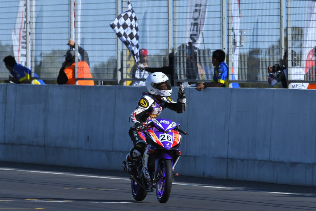 On Lap 5, Helmi’s bike sputtered to a stop. This left Haziq alone at the sharp end of the group where he went on to win the Underbone 150cc Race 2 with 16’07.730s.